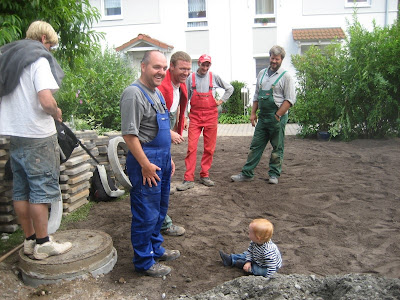 Juhuuu ich krieg nen neuen Garten!!! Die warten schon alle darauf, daß ich sage was sie machen sollen. Aber ich find den Sandspielplatz echt cool. Was wollen die denn alle mit Rasen?? Im Sand zu spielen macht doch viel mehr Spaß. In den letzten Tagen konnte ich dem Bagger zuschauen, wie die die ganzen Bambuswurzeln aus dem Boden gebaggert haben. War voll cool!! Ich will auch mal Baggerfahrer werden!!!