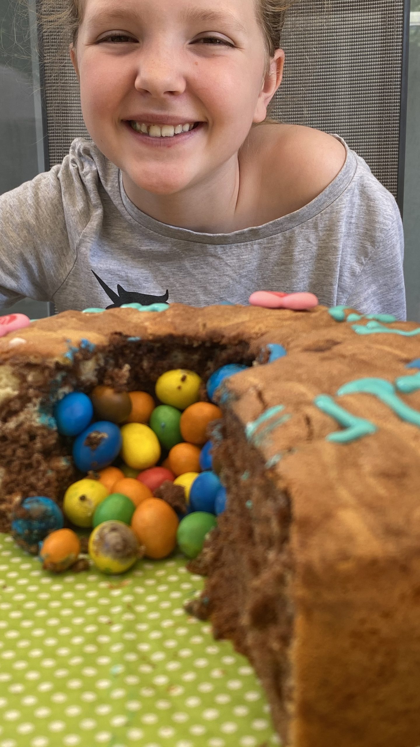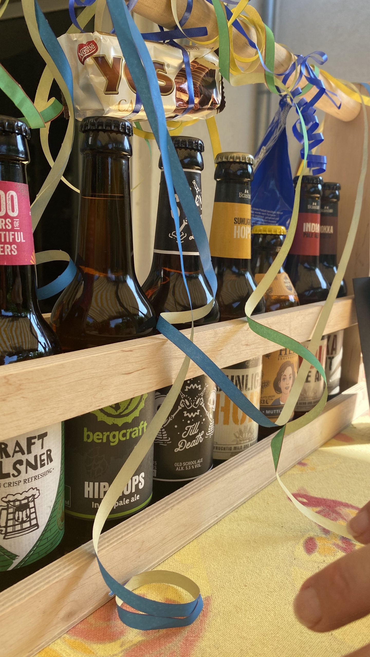 Zuerst gab es das obligatorische Vatertags-Bier in Form von 8 verschiedenen Sorten Craft-Bier verziert mit einer wunderschönen Holzsägearbeit von Philipp in Form einer Tulpe. Luisa überraschte mich mit einem sehr leckeren, selbstgebackenen Marmorkuchen mit besonderem Inhalt. Beim Anschneiden des Kuchens purzelten aus der Mitte ganz viele M&M’s – Überraschungen gelungen. Zum krönenden Abschluss gab es dann noch eine Erdbeer-Biskuitrolle von Chrissi. Im Schlaraffenland kann es nicht schöner sein.