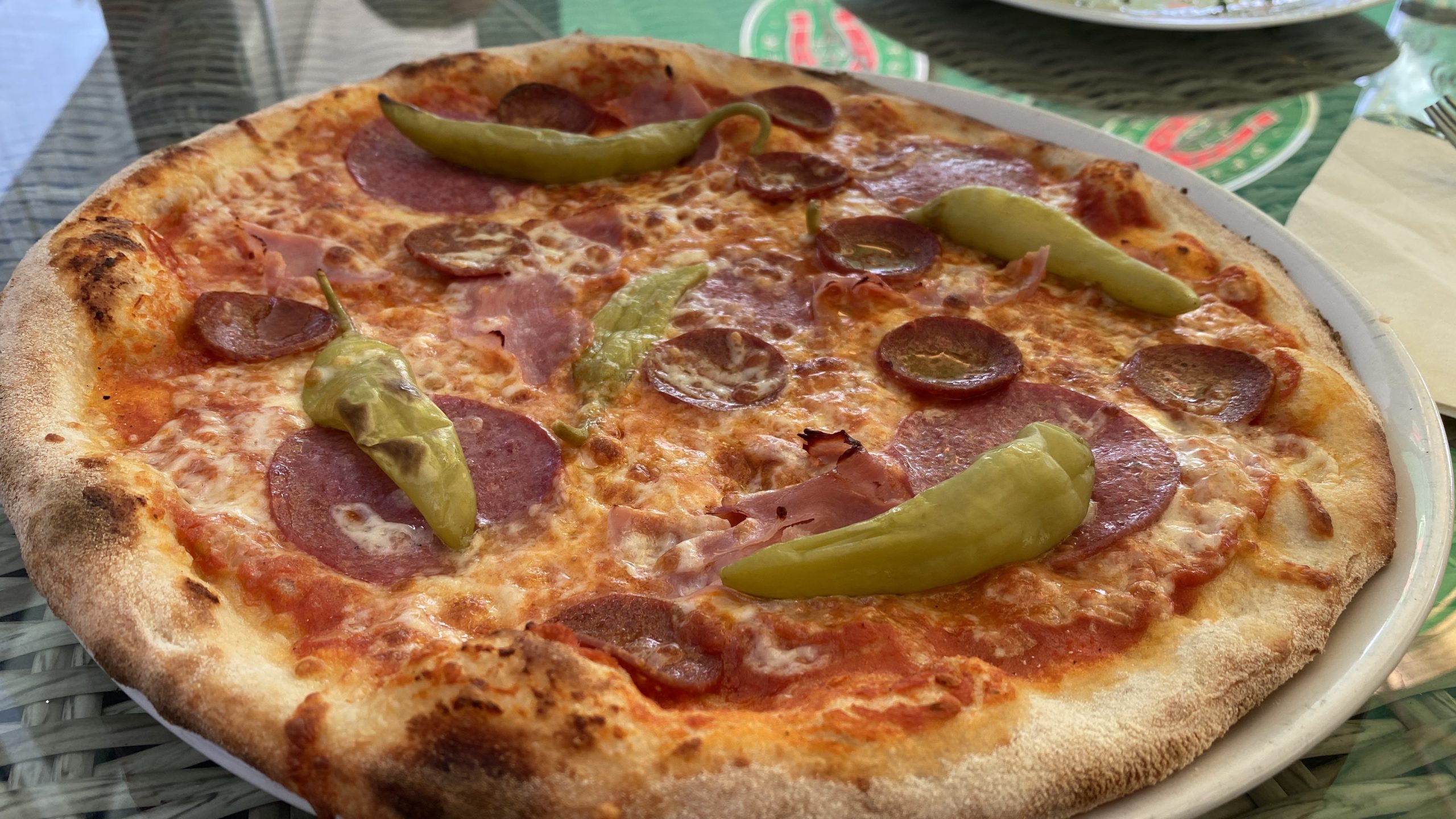 Als wir nach dem Niederwaldsee durch das nahegelegene Rodau gefahren sind, hat sich bei Luisa der Hunger bemerkbar gemacht. Zwar wollten wir am Abend grillen, aber bis dahin waren es noch ein paar Stunden und mit knurrenden Magen Fahrrad fahren geht garnicht. Kurzentschlossen sind wir in die Pizzeria Trattoria eingekehrt an der wir zufällig vorbei gefahren sind. Ein absoluter Glücksfall wie sich heraus stellen sollte. Neben einem sehr freundlichen und lustigen Wirt gab es hier mit Abstand die beste Pizza die ich seit langem gegessen hatte. Auch der italienische Salat von Chrissi sah sehr gut und frisch aus und genauso hat er auch geschmeckt. Hier waren wir mit Sicherheit nicht das letzte mal zu Gast.