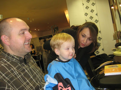Eigentlich wollte er ja gar nicht und alle Lockungen – sei es Gummibärchen oder Schokolade wurden konsequent abgelehnt. Aber irgendwann muß es mal sein – also haben wir ihn einfach „hingeschleppt“. Dort haben wir erst mal ein bissi erzählt und dann kam die Frisörin mit einem Wassersprüher und hat ihm die Haare ein bißchen naß gemacht. Das war das erste Mal, wo er sogar mal kurz lachen konnte. Wundersamerweise saß er echt sehr ruhig da und hat alles über sich ergehen lassen und hat Bilder geschaut. Aber man sah ihm an, daß es ihm nicht geheuer waren. Erst ganz am Schluß hat er die Schultern nicht mehr hochgezogen 🙂