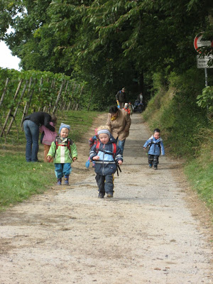 Da sind die Wühlmäuse nach einem Morgen im Wald. Alle mit Matschklamotten ausgerüstet, damit man ohne naß zu werden im Wald rumtoben kann. Der Philipp geht sehr gerne dorthin und hat auch schon einen Freund gefunden, den Nikolas. Mit dem muß er immer arbeiten. Hecken schneiden, Feuer löschen, Stöcke sammeln, Löcher graben, Bäume umsägen und so weiter. Manchmal klaut er auch den Mädels Schnuller und Mützen – was nicht sehr nett ist – aber sich hoffentlich bald legt.