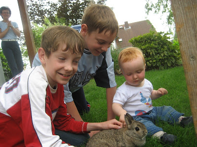 Schaut mal her wie mutig ich bin!!! Ich hab einen wilden Brecher Hasen gestreichelt – natürlich unter strenger Aufsicht von Marco und Lukas. Ich wollte gar nicht mehr aufhören, denn das Fell war sooo weich!! Die Preßlers fanden das ganz toll, daß ich jetzt so schön an der Hand laufen kann.