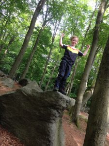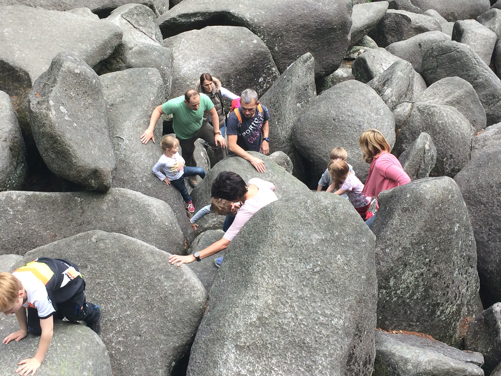 Chrissi, Anne und Michel hatten sich spontan dazu entschieden zum Felsenmeer zu wandern. Der Rest schwang sich mit Sack und Pack in die Autos. Am Felsenmeer angekommen ging es dann auch gleich schon ans Klettern. Natürlich sollte der Berg über die Felsen und nicht über die Waldwege erklettert werden. Philipp ist gleich wie eine Bergziege vorweg gestürmt und wart anschließende nur noch gesehen wenn er faul auf einem Stein liegend auf den Rest der Truppe wartete. Aber auch die Laura, Luisa, Mia und Jasmin entpuppten sich als wahre Kletterkünstler auch wenn sie es bei den großen Felsen wegen ihrer kurzen Beine ungleich schwerer hatten wie wir Großen.