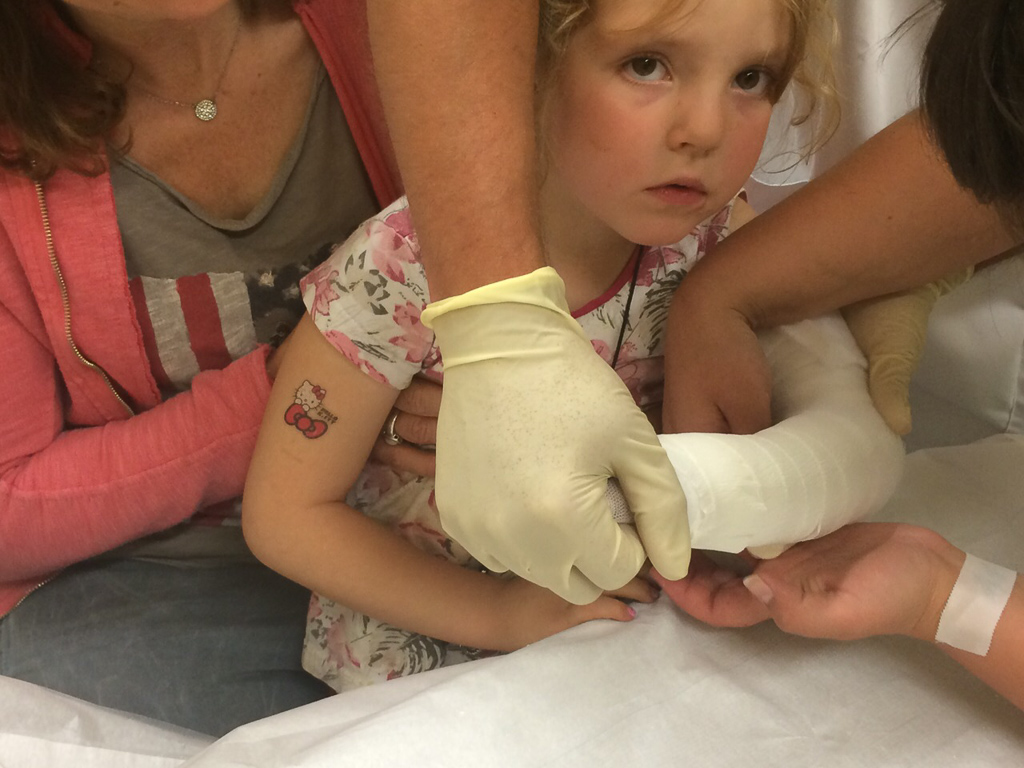 Hier bestätigte sich dann unserer Befürchtung, der Arm war knapp über dem Handgelenkt gebrochen. Ein sogenannter grüner Bruch der häufig bei Kindern vorkommt. Hier bricht zwar der Knochen, wird aber noch von der Knochenhaut in Position gehalten. Röntgen war schmerzhaft da der Arm entsprechend gedreht werden mußte, beim anschließenden gipsen überwiegt dann schon wieder mehr die Neugier und Interesse wie das denn nun alles gemacht wird.
