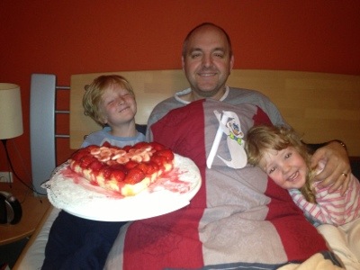 Noch leicht verschlafen und ziemlich verschnupft, wurde ich heute Morgen von meinen Liebsten aus dem Tiefschlaf geweckt. Aber bei so einem leckeren, von Luisa und Chrissi selbst gemachten Herzerdbeerekuchen war man sehr schnell wach. Von Philipp gab es noch ein selbst gebasteltes Geschenk. Das hat mich sehr sehr gefreut. Der Kuchen hat das Frühstück natürlich nicht überlebt und war sehr lecker.