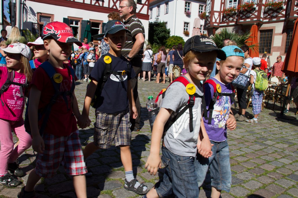 Kurz vor 10:oo Uhr, haben wir Florian und Thomas abgeholt und sind dann gemeinsam auf den Marktplatz marschiert. Dort war schon mächtig Trubel. Hunderte von Kindern und Jugendlichen waren auf der Suche nach ihrer Gruppe.