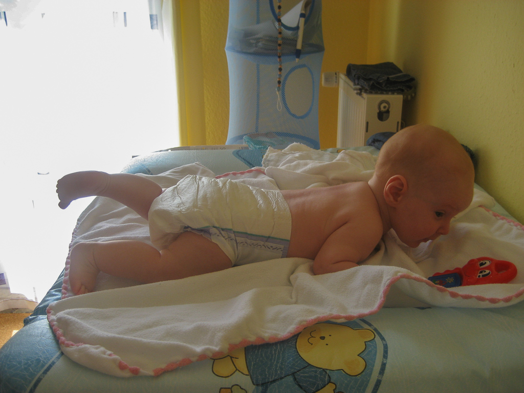 Wer sich irgendwann einmal von der Bauchlage in die Rückenlage drehen möchte (oder umgekehrt) muß regelmäßig zum Krafttraining. So auch unser Philipp. Förderlich an der Aktion ist, dass Philipp die Bauchlage eigentlich überhaupt nicht mag weil er a) außer der Wickeldecke nicht viel sieht und b) mit der Nase in seiner ausgespuckten Milch liegt *g*