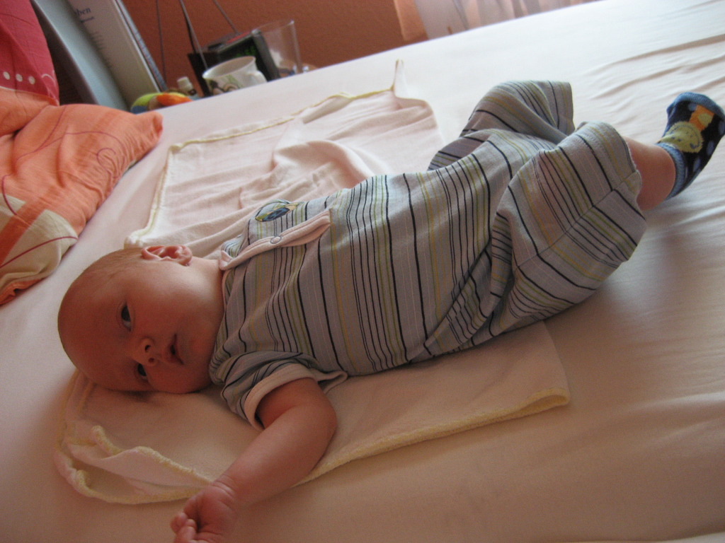 Philipp entwickelt sich prächtig – schon ein Wahnsinn wie er sich von Tag zu Tag verändert. Hat man vor vier Wochen beim Wickeln noch Angst die Arme zu zerbrechen wenn man ihm ein Body angezogen hat, so hat man mittlerweile Schwierigkeiten die Arme überhaupt noch durch die Ärmchen der Bodys zu bekommen.