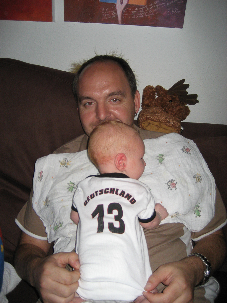 Philipp hat während des Spiels auch alles gegeben (man beachte das Spucktuch um meinen Hals). Als hätte er eine Vorahnung. War er doch während des ganzen Spiels recht unruhig und verlangte öfters als normal einen Extraschluck aus der „Pulle“. Muss wohl genetisch bedingt sein, dass Männer während sie sich Fußball anschauen, immer etwas trinken müssen :-)))