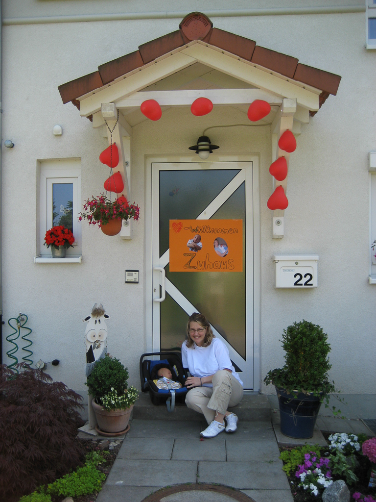 Heute ist der große Tag. Am Nachmittag hole ich endlich Philipp und Christine vom Krankenhaus nach Hause. Recht aufgeregt räume ich noch zusammen mit meiner Schwiegermutter das Haus auf und bastel noch ein kleines Willkommens-Schild für die Haustür. Und dann nix wie ab ins Krankenhaus.